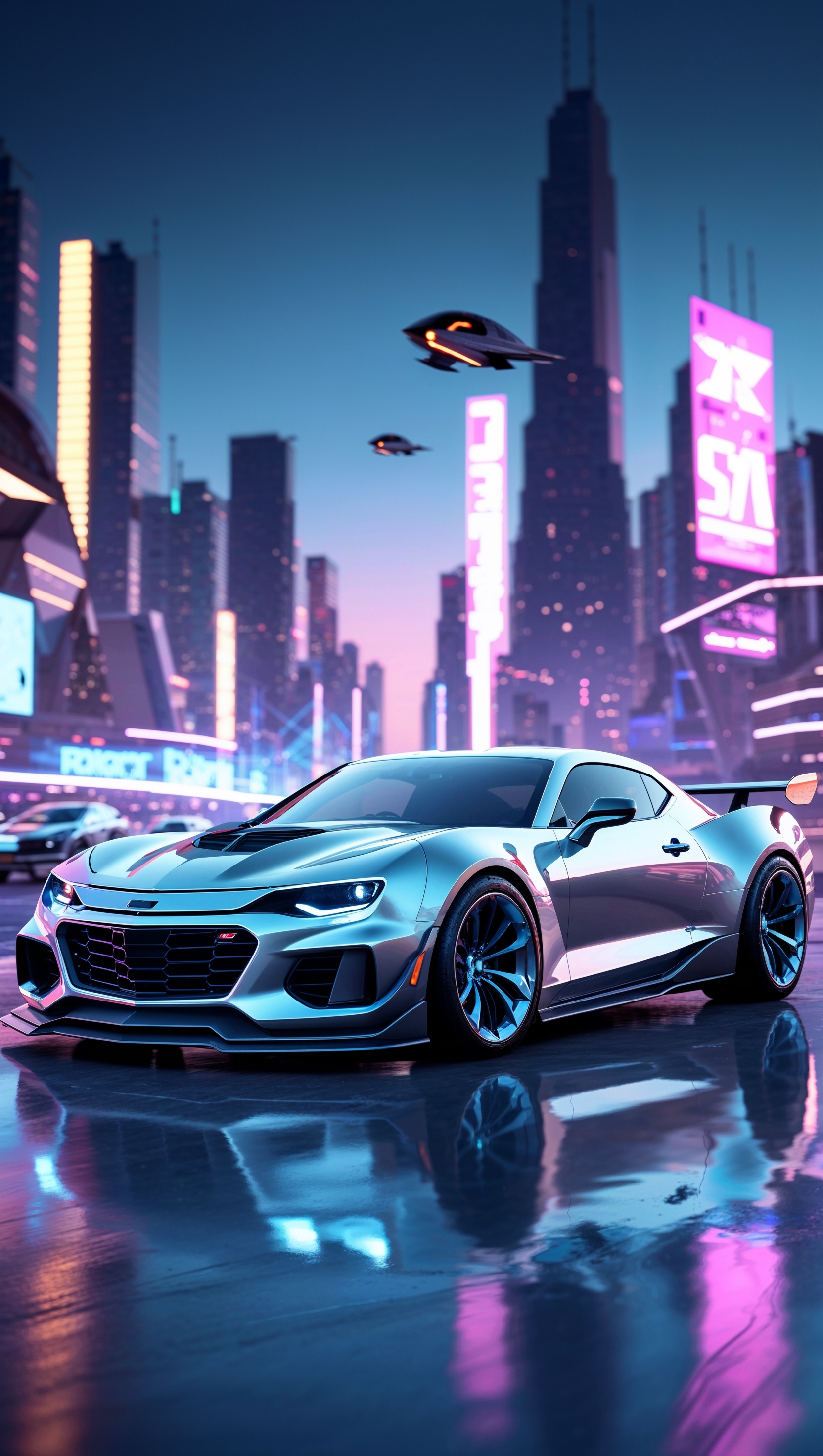 A silver Chevy sports car in front of a futuristic city, sci-fi vibe, iPhone wallpaper 1664x2944 A silver Chevy sports car in front of a futuristic city, sci-fi vibe, iPhone wallpaper