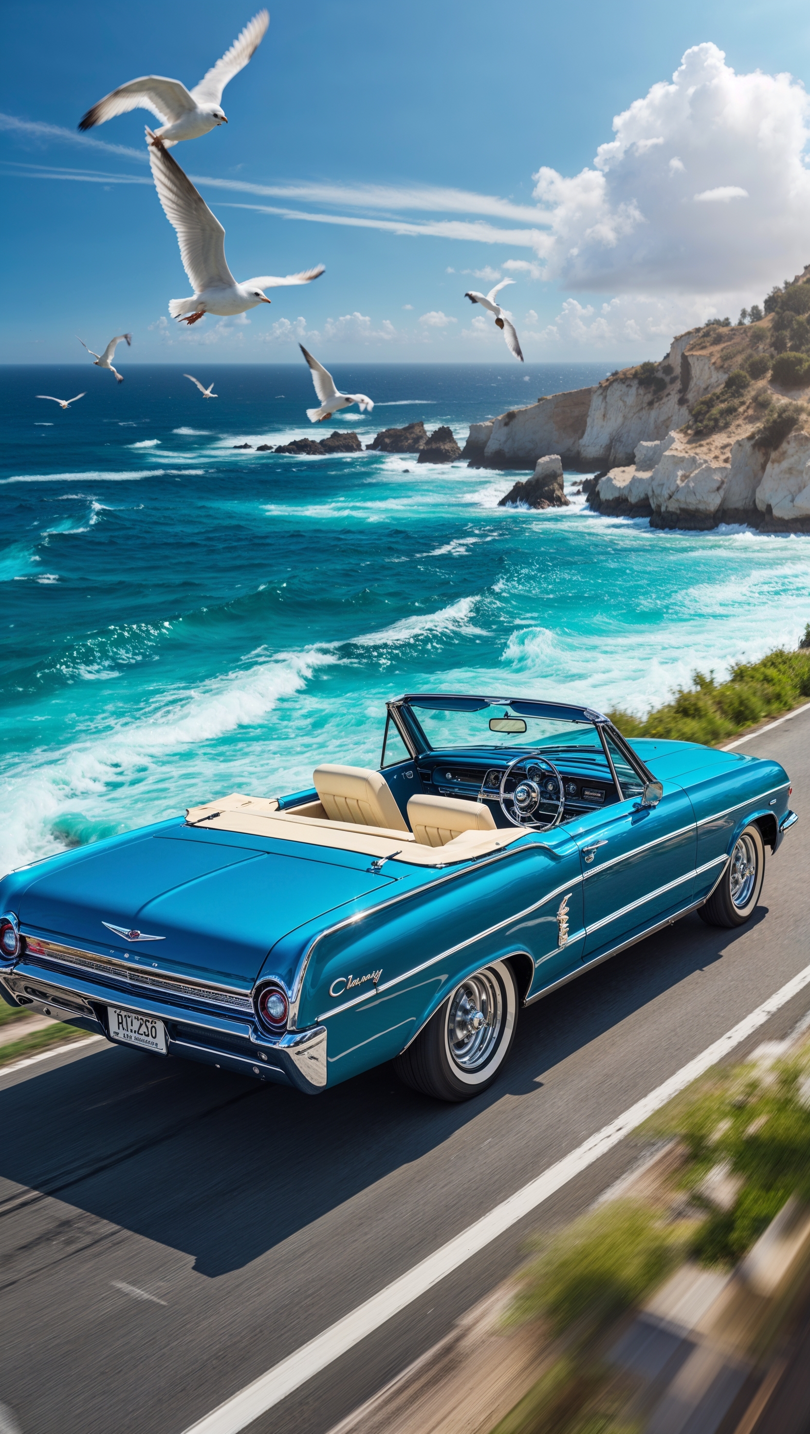 A blue Chevy convertible driving along the coast, summer vibes, iPhone wallpaper 1664x2944 A blue Chevy convertible driving along the coast, summer vibes, iPhone wallpaper
