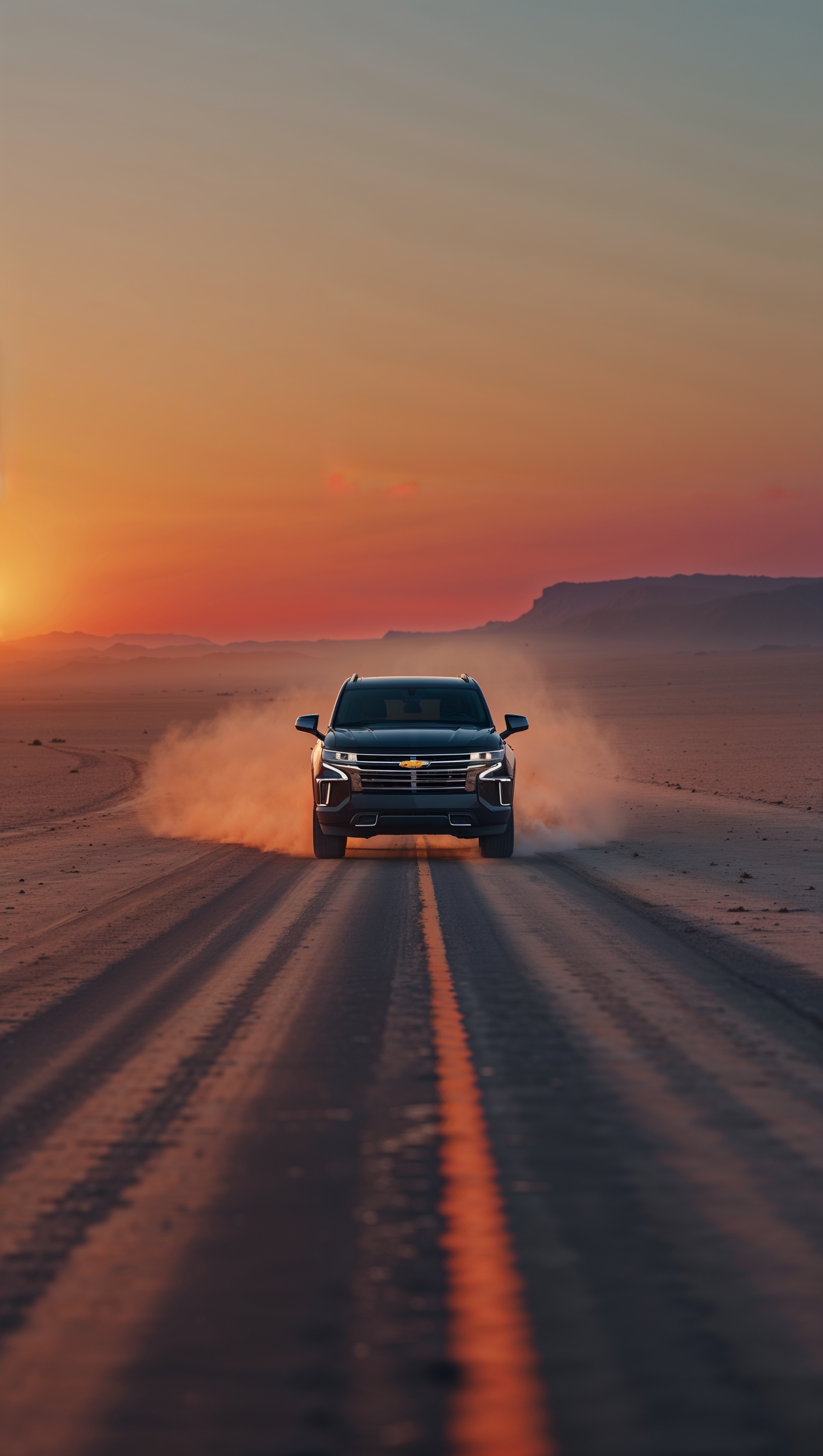 Desert highway with a lone Chevy SUV driving at sunset, cinematic frame, iPhone wallpaper 1664x2944 Desert highway with a lone Chevy SUV driving at sunset, cinematic frame, iPhone wallpaper