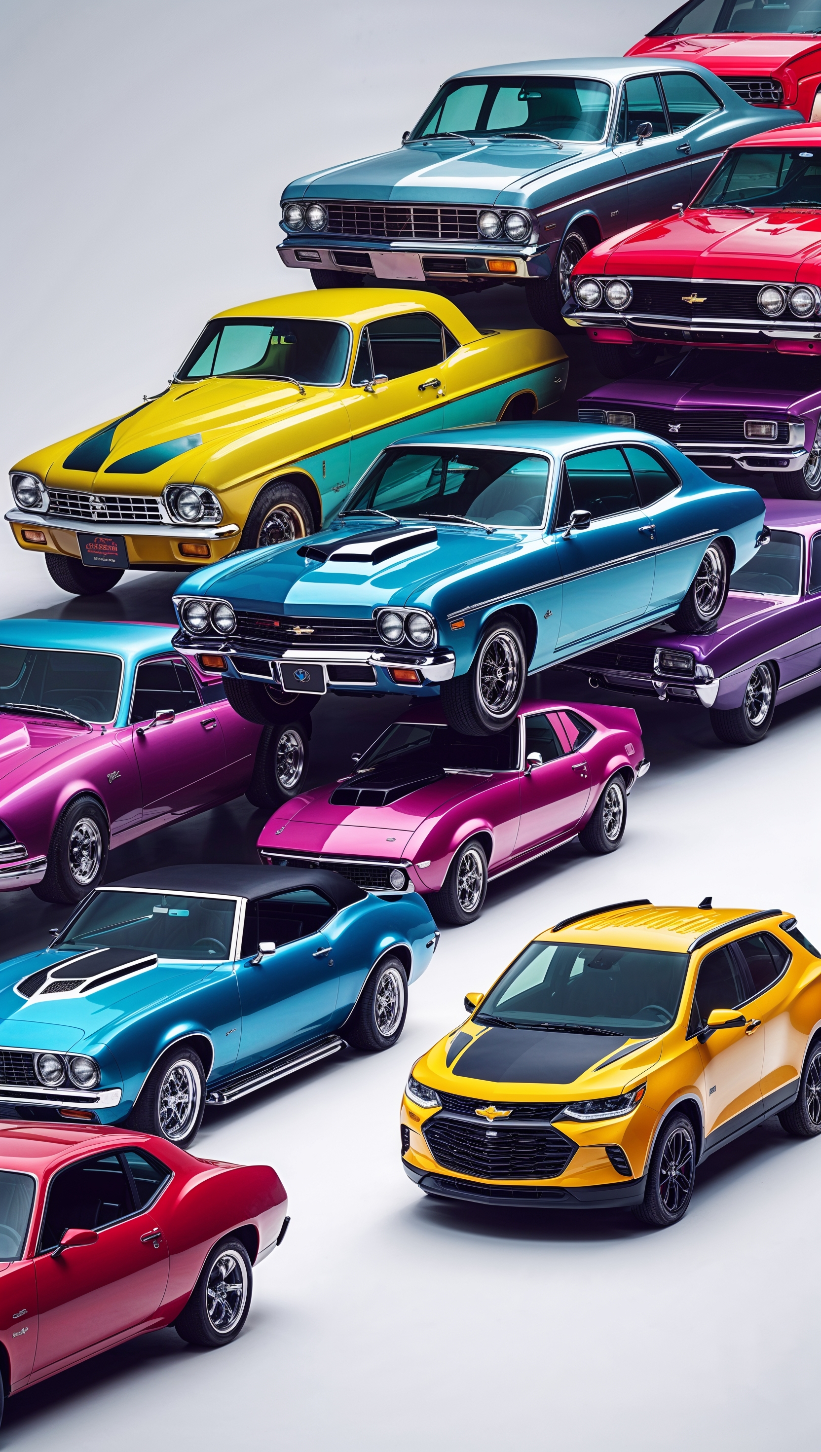 A lineup of different Chevy models from each decade, collage style, iPhone wallpaper 1664x2944 A lineup of different Chevy models from each decade, collage style, iPhone wallpaper