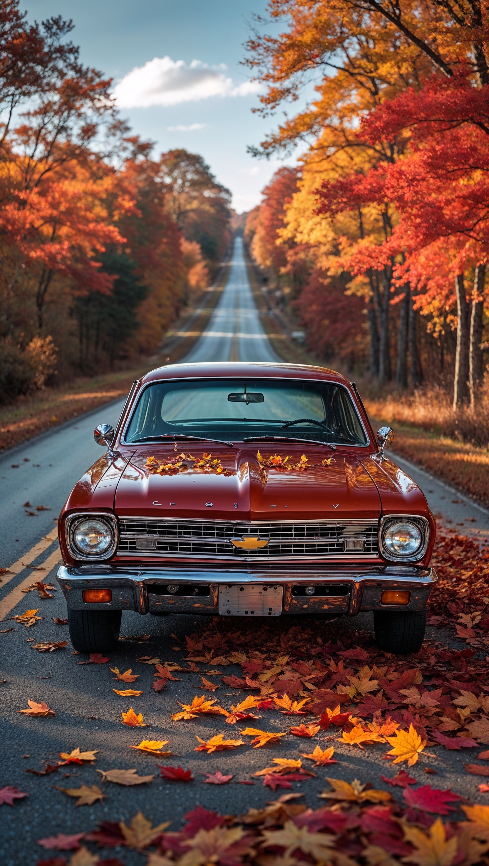 Chevy Nova surrounded by autumn leaves on a quiet road, cozy feeling, iPhone wallpaper 1664x2944 Chevy Nova surrounded by autumn leaves on a quiet road, cozy feeling, iPhone wallpaper