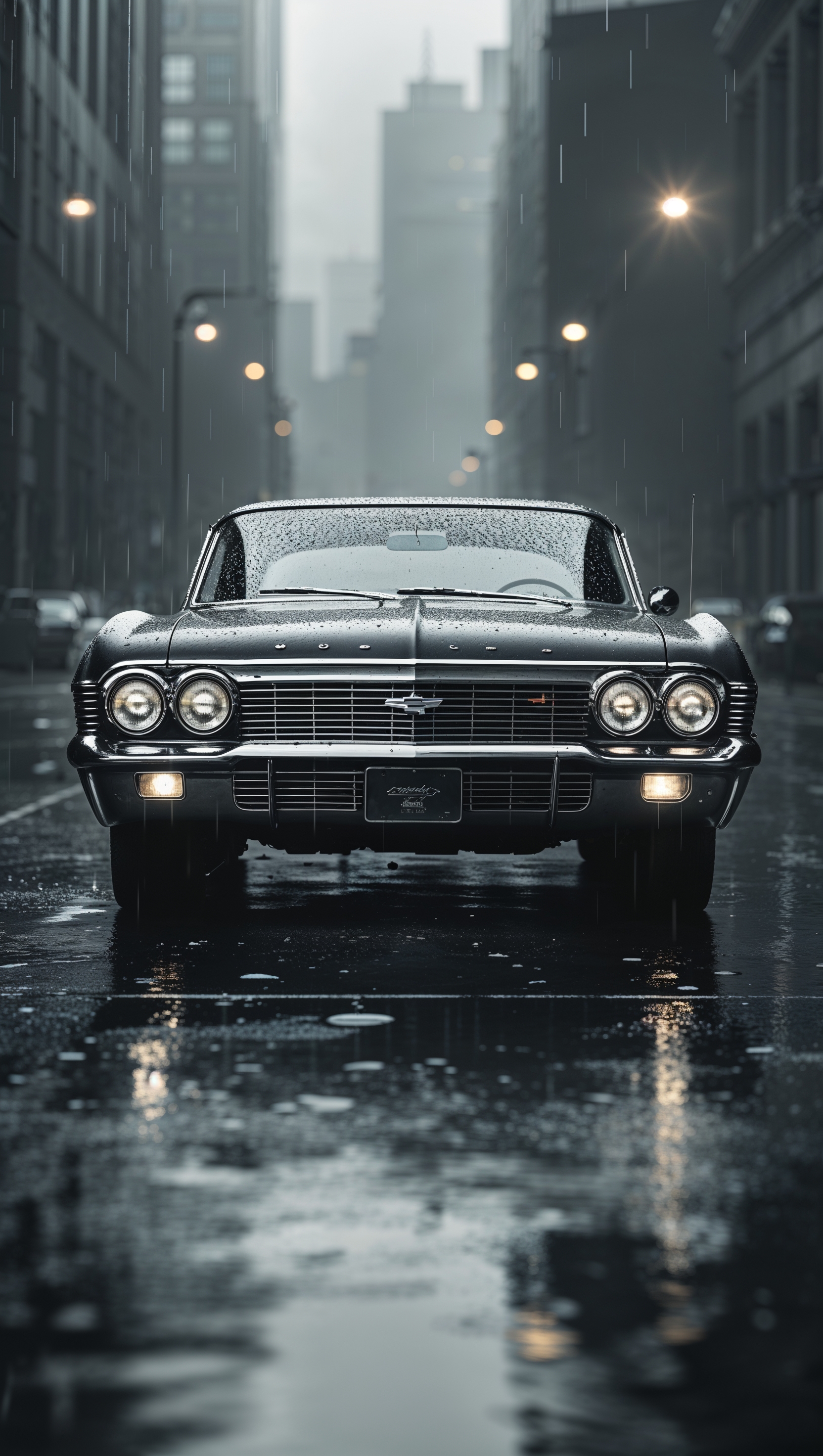 Moody black-and-white photo of a classic Chevy in the rain, vintage film look, iPhone wallpaper 1664x2944 Moody black-and-white photo of a classic Chevy in the rain, vintage film look, iPhone wallpaper