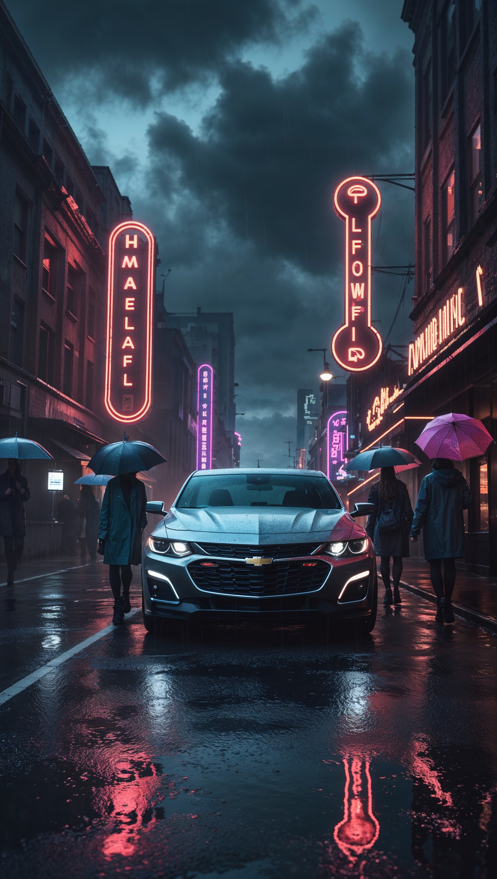 A rainy city street with a Chevy Malibu reflecting neon lights, moody and stylish, iPhone wallpaper 1664x2944 A rainy city street with a Chevy Malibu reflecting neon lights, moody and stylish, iPhone wallpaper