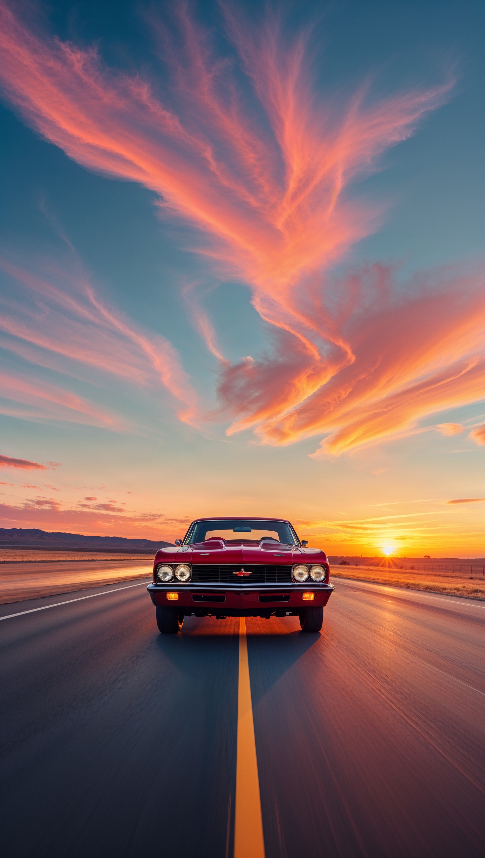 Epic sunset behind a Chevy on a long open highway, dramatic colors, iPhone wallpaper 1664x2944 Epic sunset behind a Chevy on a long open highway, dramatic colors, iPhone wallpaper