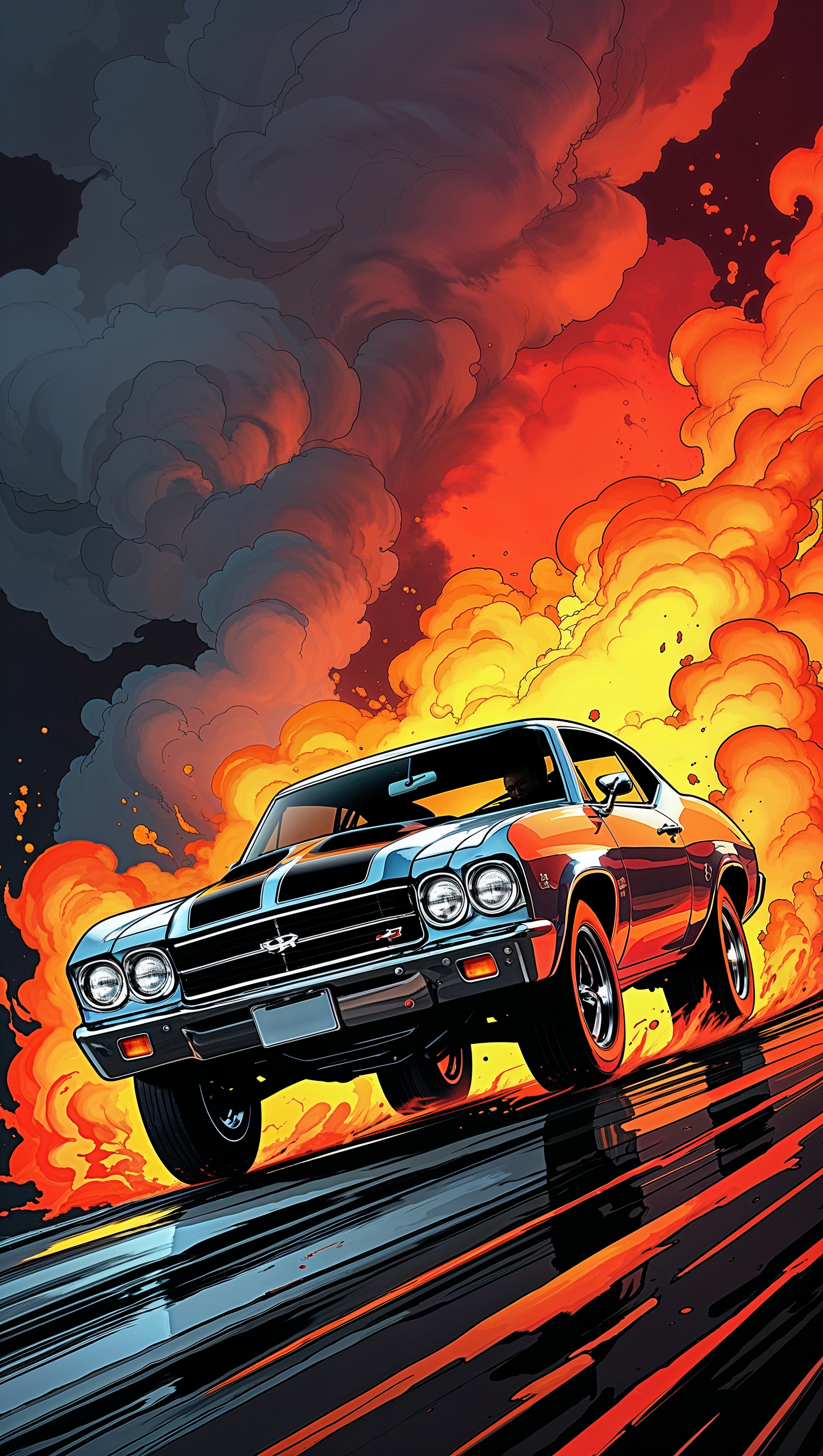 A Chevy muscle car bursting through flames, action-packed style, iPhone wallpaper 1664x2944 A Chevy muscle car bursting through flames, action-packed style, iPhone wallpaper