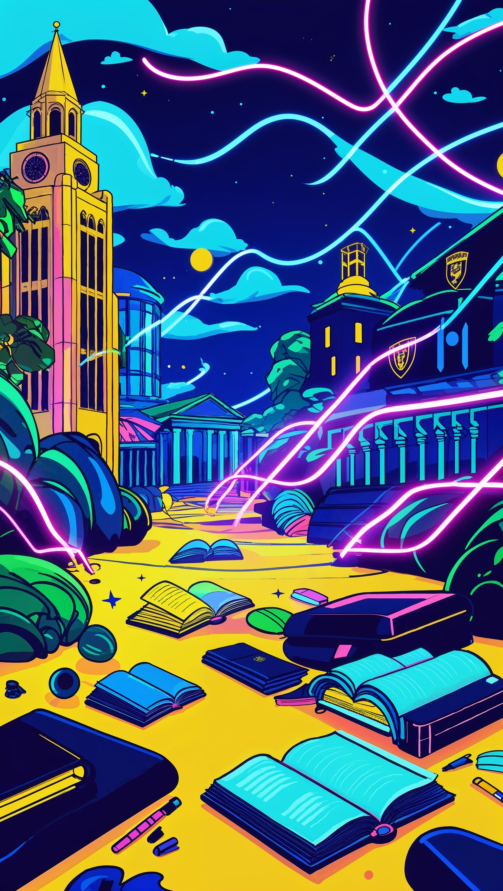 1664x2944 Illustrate a digital wallpaper with university elements and neon lines, blending daytime and nighttime aesthetics